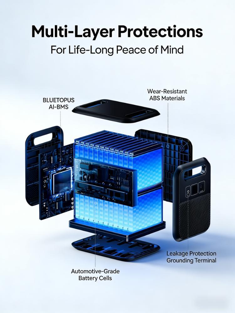 Long-Lasting Performance - 17-year lifespan with auto-grade LFP batteries (6000+ cycles) and multi-layer protection for safe use in extreme conditions.